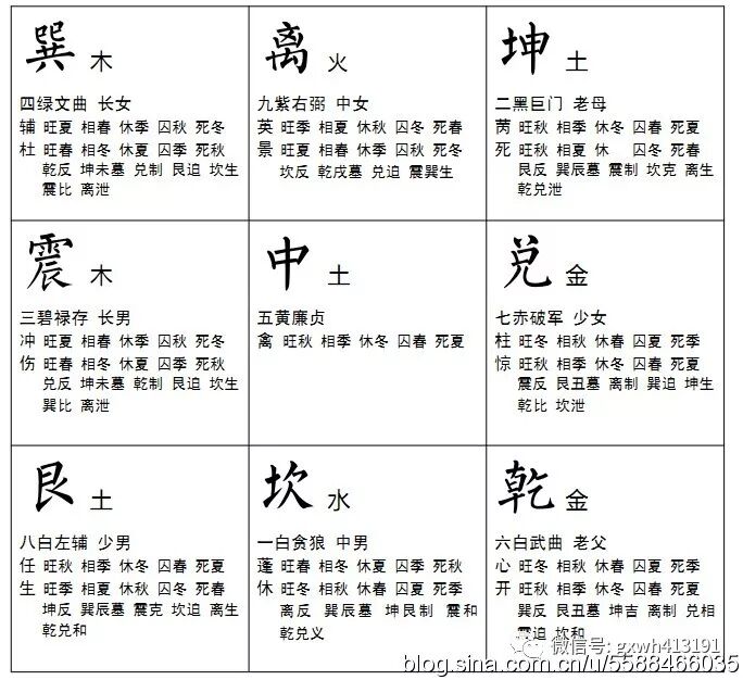 要识九星配五行,名随八卦考羲经。 坎蓬星水离英火, 中宫坤艮土为营,