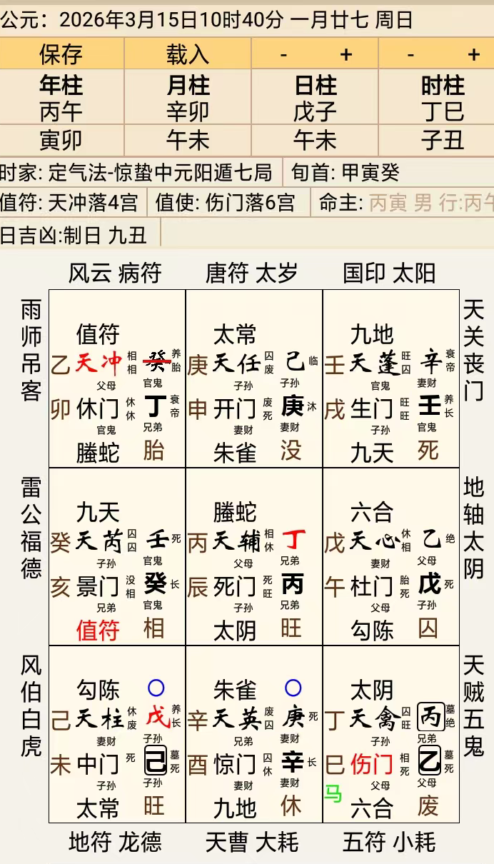 “我”年命做兄弟爻,落在乾宫,入墓,宫中又见伤门、丁巳(值使)、太阴、天禽等星门神将。