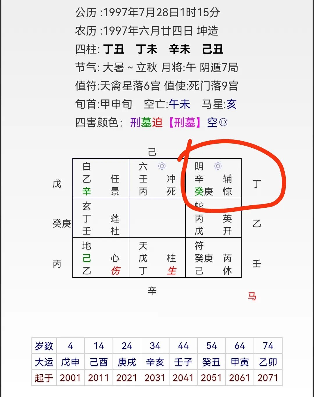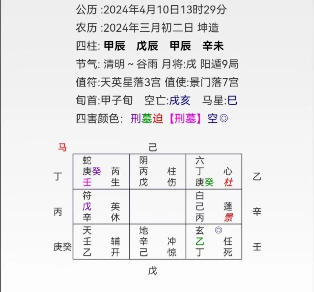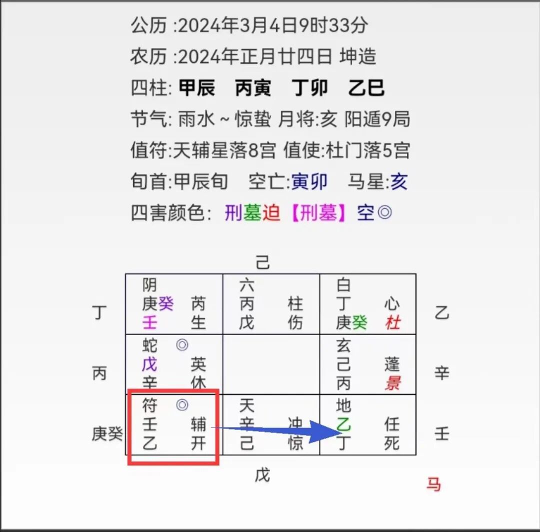 起局后显示:用神宫在艮,显示出了孕育信息,时干子女为子女信息,落在乾宫,乙坐下有丁,丁是男孩,丁在乾为胎地,本宫看去胎象并不稳定。