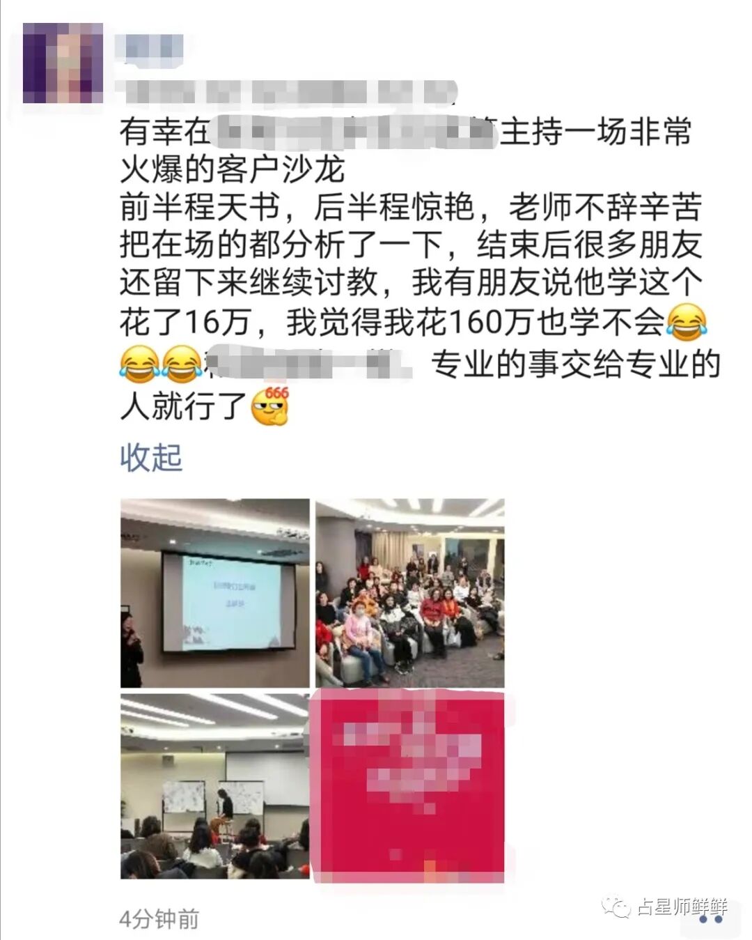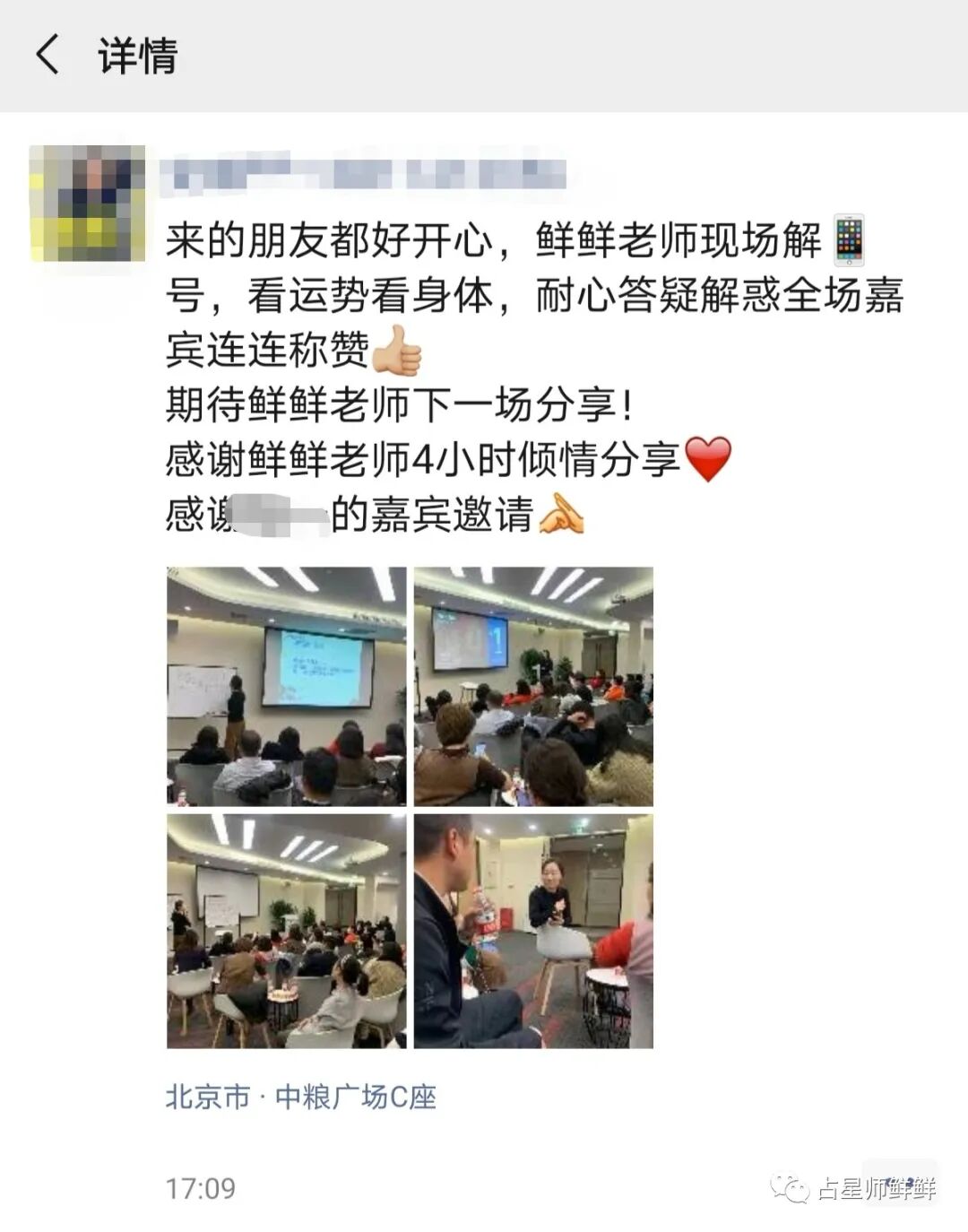 感谢主办方的邀请,到场嘉宾,以及我师妹、微博粉丝、之前给我调理身体扎过针灸的中医老师,还有素未谋面但是N年前的老客户(不跟我打招呼我根本认不出来)以及把我所有命理风水等服务体验了一遍的客户、朋友们。感谢大家在百忙的寒冬抽出宝贵时间与我一起度过这美好的时光。天气是寒冷的,心却是火热的。课后天降瑞雪,也是祝大家福慧增长,寿禄延绵。