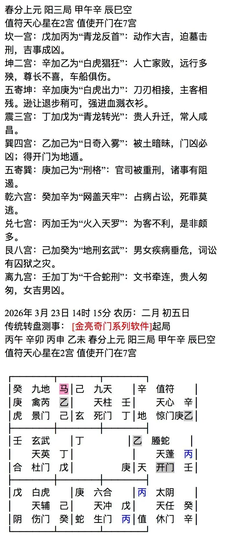 下一步,随马星飞到对宫的乾六宫,癸加辛,“网盖天牢”,占病占讼,死罪莫逃。而用神是太阴,转值符,天任星,休门。