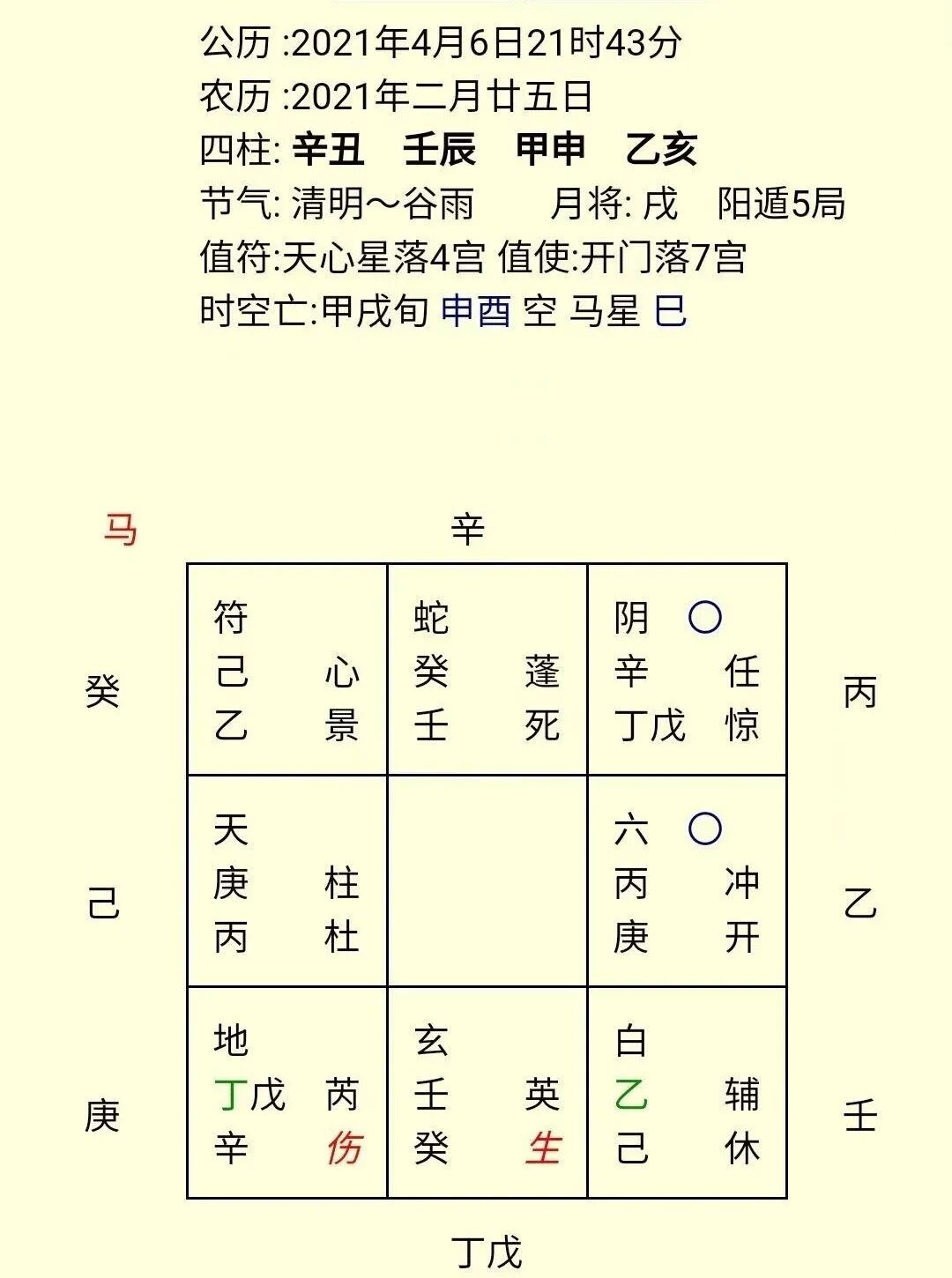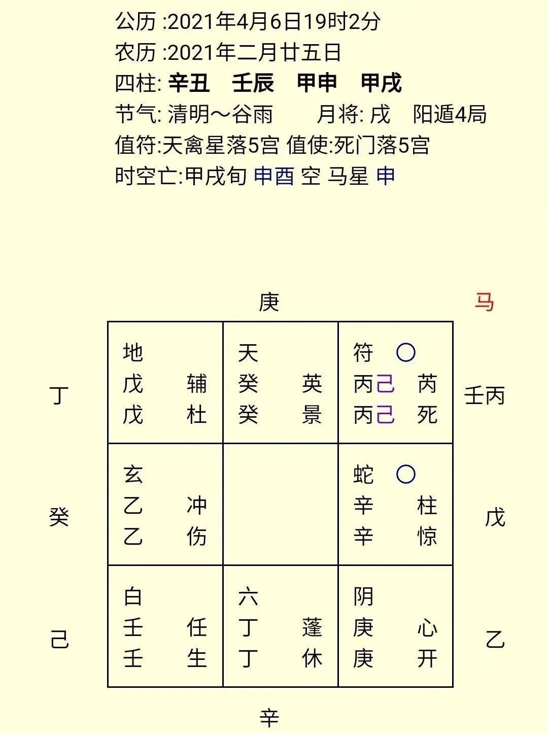 看事业,看值符落宫就可以。值符在巽宫,临马星,乾宫白虎,说明最近事业遇到是非,纠纷类事情。己代表钱,甲己相合,说明因为钱被牵扯了。巽宫数字147