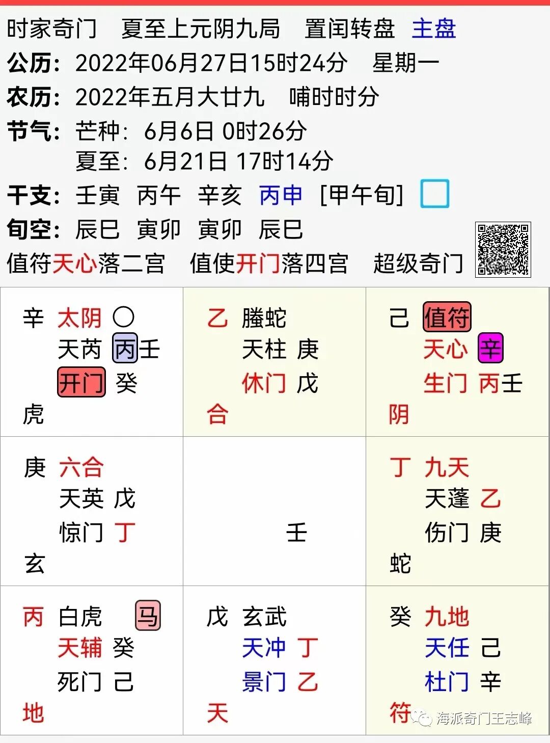 2、日干辛,地盘干在乾6宫,己方年命也落乾6宫,暗八神为值符。