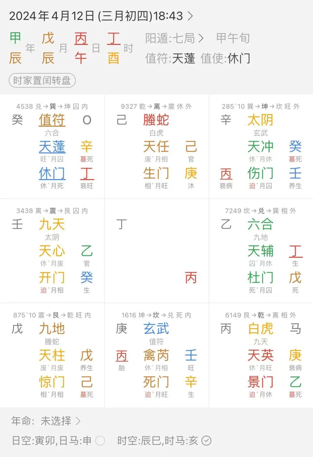 日干为丙在坎宫,时干落兑宫,丁长生,临六合,杜门,宫迫。代表技术没学通,还差点意思。是干生日干。丁为分数,考试成绩应该可以。再看值符合指使门空亡,辛加丁狱神得奇,这次被关起来,下次才可以,先曲后直,肯定考不过。后面反馈分数可以,但是今年卡人数,还是没有通过。