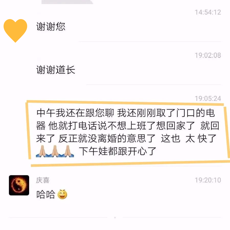 我把庆喜老师微信推给小丫,过了两天小丫微信告诉我,她老公打电话说“想回家了”,没有离婚的意思了。她和孩子都特别开心!