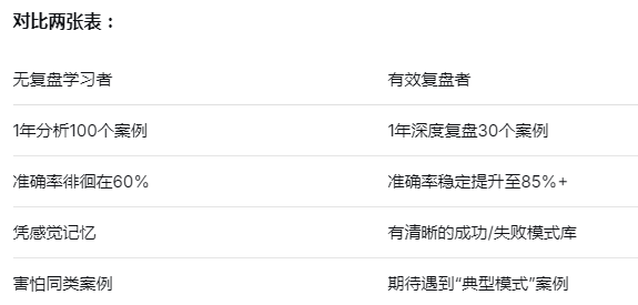 一次完整复盘 = 原始判断 ×(结果反馈 + 过程拆解 + 模式识别 + 策略优化)
