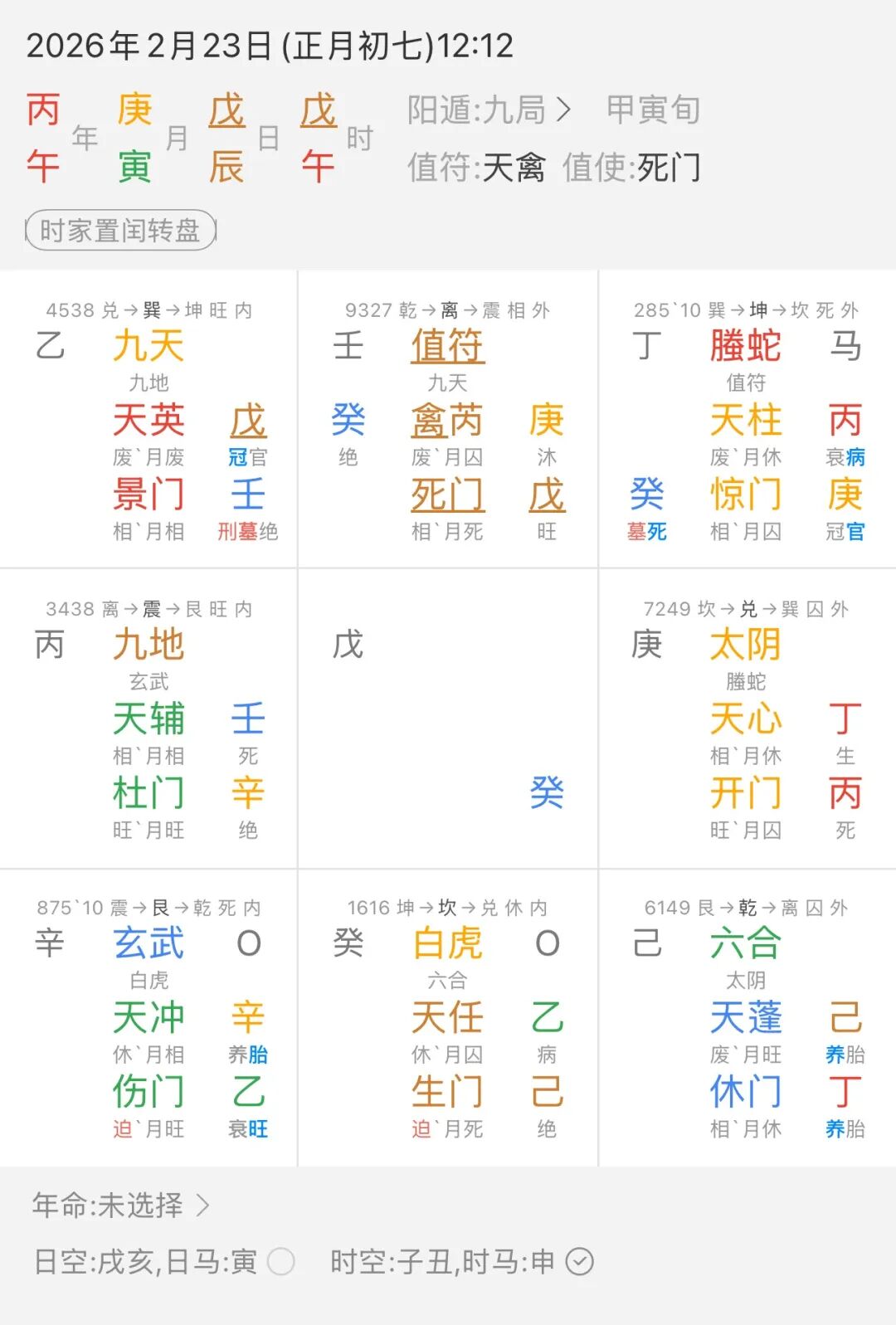 分析如下:日干和时干同宫,都在巽宫,戊还处在冠带位置,很明显丢不了。再看癸水在离宫,临符使,猫咪很安全,也丢不了。所以我说让他去东南和南边找找,反馈在25日庚午日找到了,正好是符使得应期。就是在我说的南边相邻的小区找到的。
