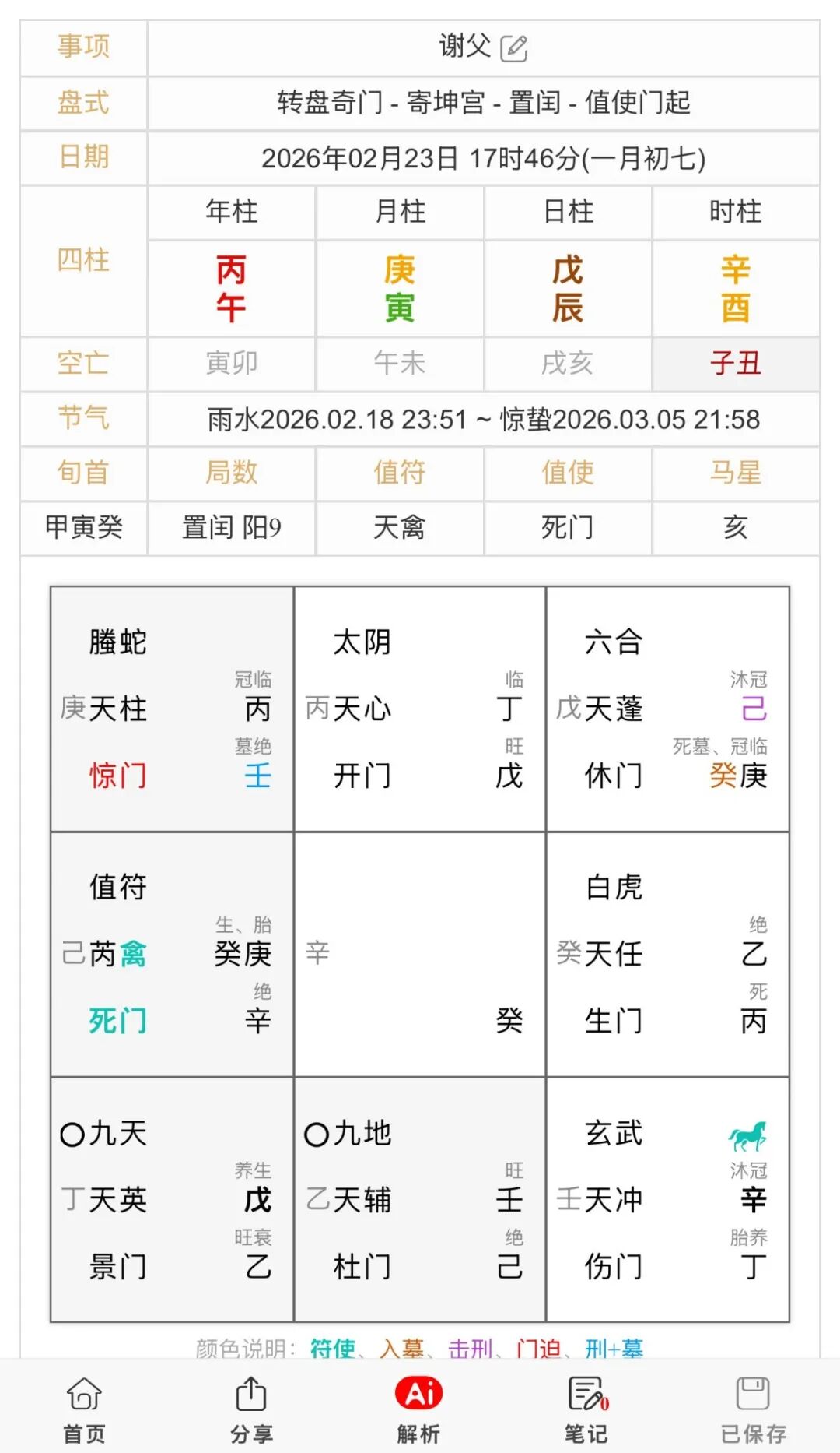 分析如下:日干落艮宫,时干落乾宫,辛+丁,吉格。天芮病落震宫,天芮星受克。兑宫乙奇正克天芮星,医生能治疗。戊土年命为养,活动受限。寅月艮宫旺,地支戌,在乾宫也不空亡。再看地盘戊帝旺在离宫,临开门吉门,丁奇。丁+戊青龙转光,丁奇到离,奇游禄位。开门+丁+太阴为真诈,也是吉格,所以没有生命危险,后面反馈人没事了。