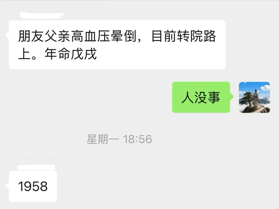 朋友父亲高血压晕倒,目前转院路上。年命1958年戊戌。