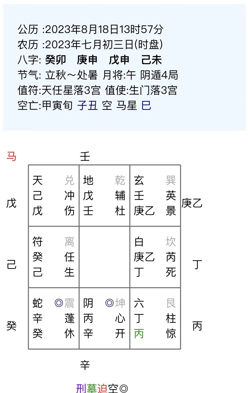 时干宫就代表这件事的走向发展,时干在巽宫,天,己戊冲伤门,己代表口,天冲伤门,后续还是会有一些口舌方面的事情,因为冲动说出一些伤人的话,但无四害,问题就不会太大!