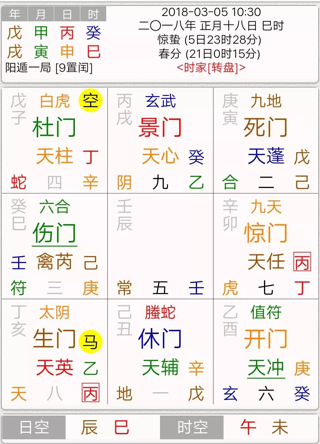 奇门遁甲策划任何一件事,首先我们都要确定用神,这是最基本也是关键的。策划事业和财运也是一样。客户王女士来工作室,找朱昆老师做个案解析,客户道:“朱老师,我上次来看过婚姻不知您是否还记得我?十分感谢您的指点,要不是您我可能早就放弃感情了。不知道最近是什么原因,最近压力十分大,工作也经常出问题,是不是我事业开始走下坡路了?请您帮我再分析一下事业吧,麻烦您了。奇门格局:戊戌年 甲寅月 丙申日 癸巳时,格局如下: