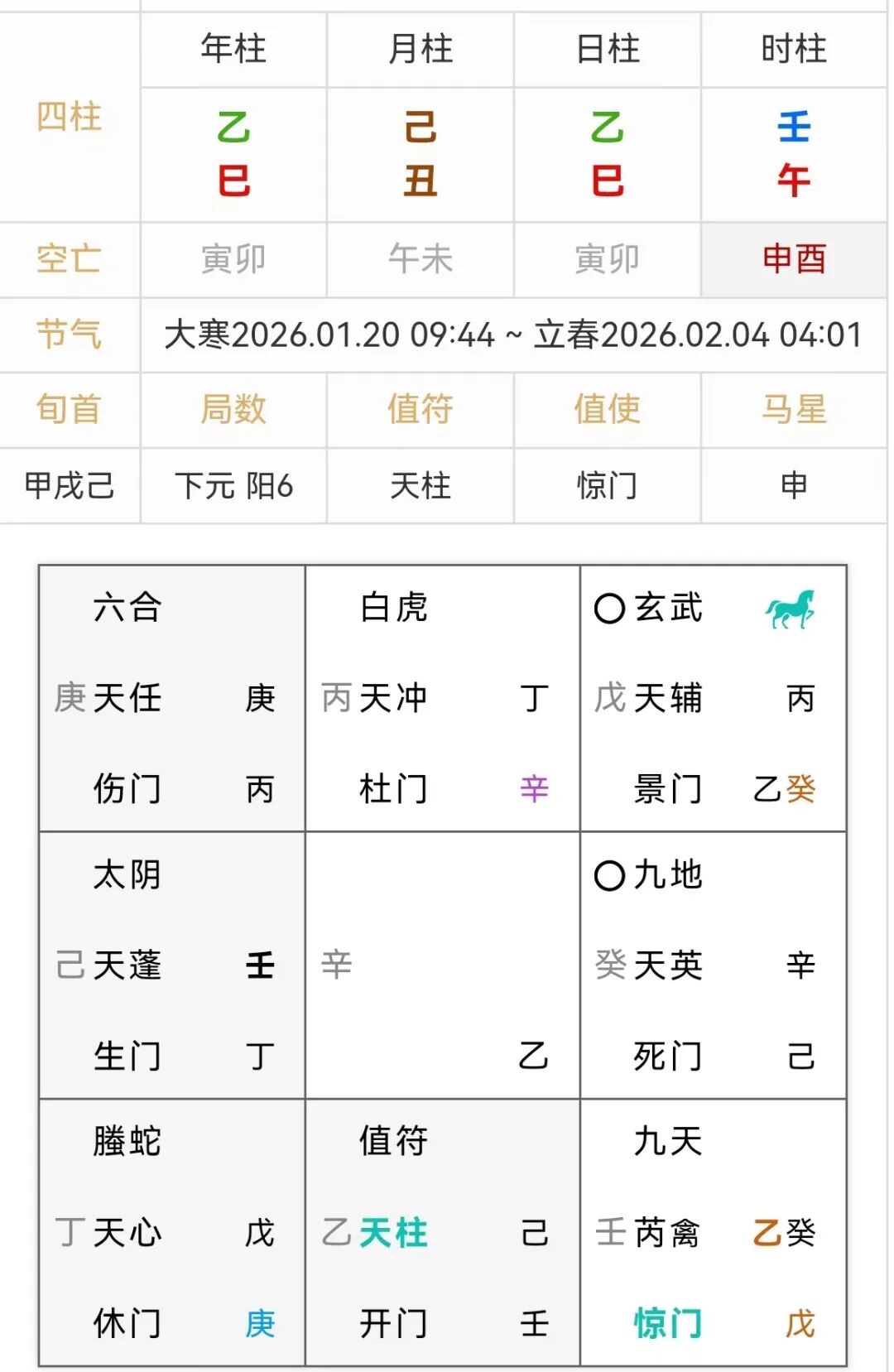再看下婚姻。六合宫临庚为丈夫,庚+丙贼必来,此格看婚姻是有第三者牵连之相。临伤门,婚姻受伤了。乙为妻子落乾宫入墓,为妻子的角色不作为,来冲克丈夫和六合宫,夫妻关系已经岌岌可危了。乙临惊门+癸临九天,妻子说了很多指责气愤的话。这里可以看出,同一个乙奇,由于分别代表了三个角色,所以会出现三种不同的解读。为什么妻子会怨恨呢?丁为第三者女人,落离宫临白虎,天冲来势汹汹,丁下临辛自刑,自身的错误,杜门悄悄的。庚临六合来生丁,临天任星坚定,求测人对外面这个女人是真心的。结合年命壬临丁逢合,临生门,两人在一起的相已经生成了。壬为六害,看婚姻为出轨。丙为第三者男人,庚下坐丙,他既是庚又是丙。
