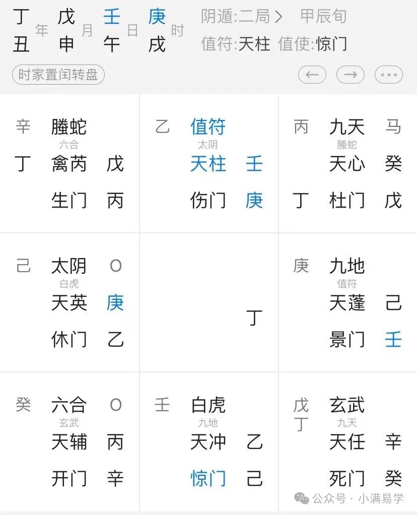 父母可以参考乾坤宫,以及年干,或者直用所谓的六亲关系的方法,这个盘有父母离异的信息,细说起来,需要参考的宫位较多,我们可以先从乾坤宫位入手,坤宫临杜门+马星,乾宫临死门辛癸,我们知道五行中金水都是阴性,寒凉之意,这里就不要再参考宫位生克,乾坤二宫永远只想生的关系,在参考年干丁丑落宫,丁在中宫,这就是暂时的,缘尽则散的婚姻,父母能力必然也是一般,也就是普通家庭条件下成长的这么一个孩子。