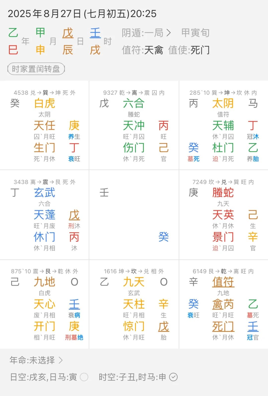 分析如下:手术不成功,首先看符使在乾宫,天芮星旺,天芮也为子宫,临死门。乙为医药,入墓,手术后吃的药作用不大。癸+壬复见螣蛇,一次治不好。再看日时,日干戊击刑,本人还是难受,时干落艮宫空亡,手术不成功,还是不能生肓。壬+庚,怀孕有阻力。转宫到坤,天盘丁年命,丁+乙另续相亲,怀孕另想办法。杜门门迫,腹部不通。再看巽宫庚+丁,加年命地盘丁,庚长生,怀孕还是有阻隔。辛为精子,空亡,癸为卵子衰。所以说还是不能生育成功。