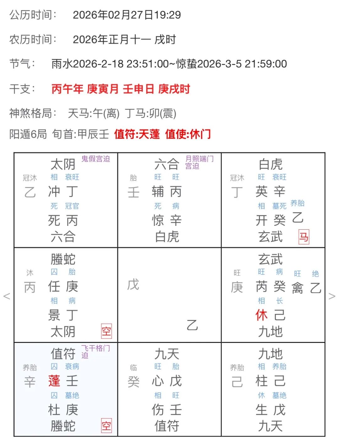 直符落在了艮宫,形成了“飞宫格”,这本身就代表一种变动或受迫的态势。再加上“杜门”有堵塞、不通畅的含义,因此整个宫位的信息,就表现出一种封闭、不沟通、不参与的姿态,但这种封闭是假象,实际隐藏着危机,并非真正的宁静。