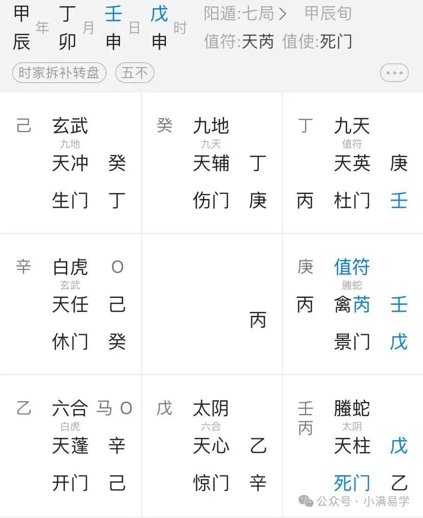 这个盘也需要抓住重点,日时关系首先为比合的状态,我们从日干宫位入手,壬水为沐浴败地,兑宫景门应了面试之象,壬水是太岁,日干与太岁比合,壬+戊小蛇化龙临上值符,暗干格局又组成一个贼必来,为客进利之象,这看似都是一个上升之象,但是壬水再者的十二长生尤为重要了,败落之意,那么虽与你比合也是不是实意支持,这里天禽星临的丙火是权柄的意思,丙临死地,这个权柄就可以理解为是虚的,不落实的了