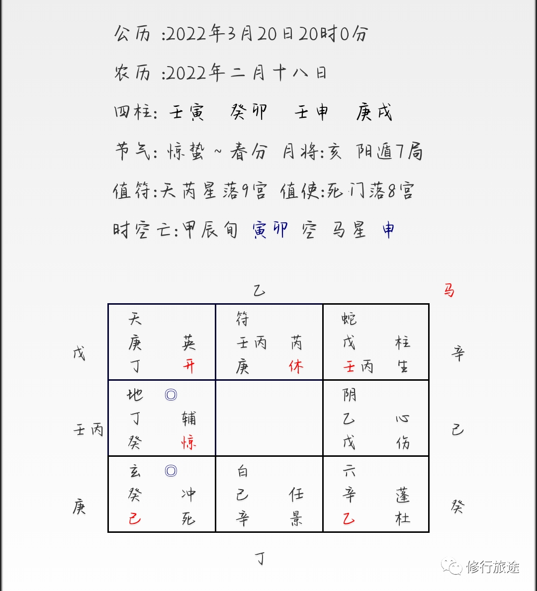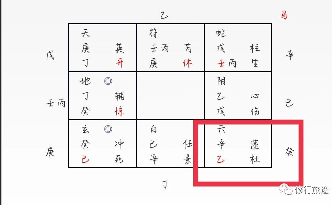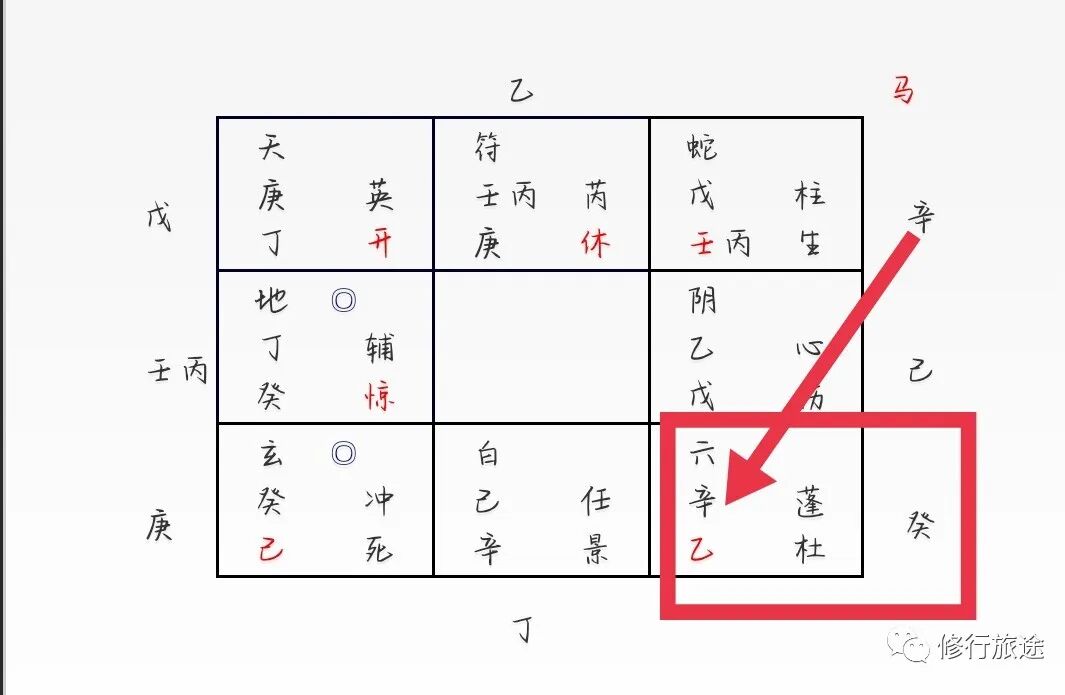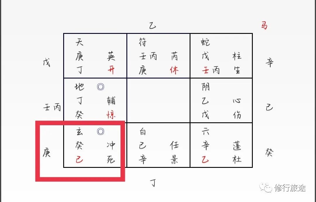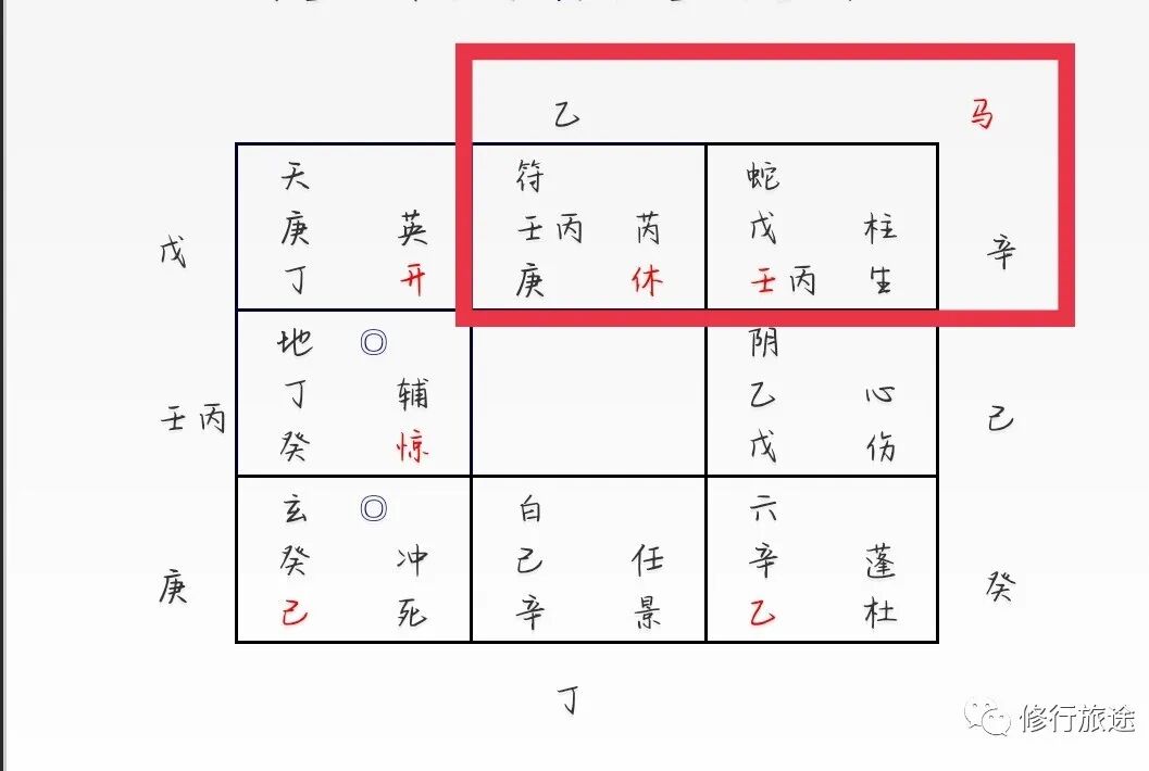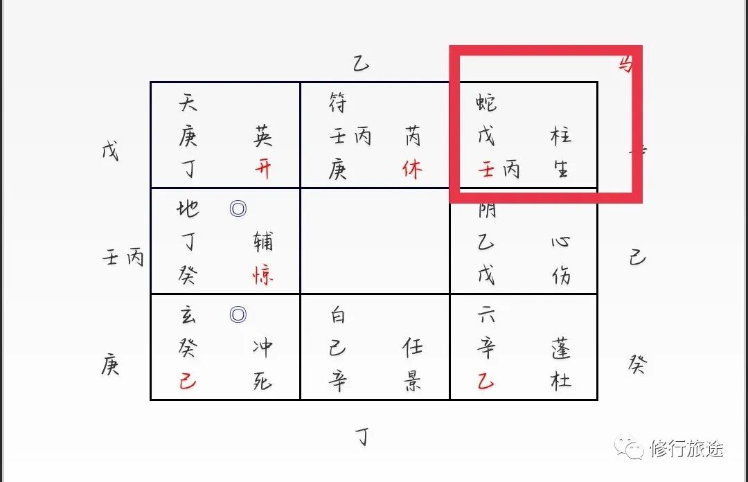 年命戊落坤宫,戊+壬丙临腾蛇、天柱星、生门,隐干辛,临马星。