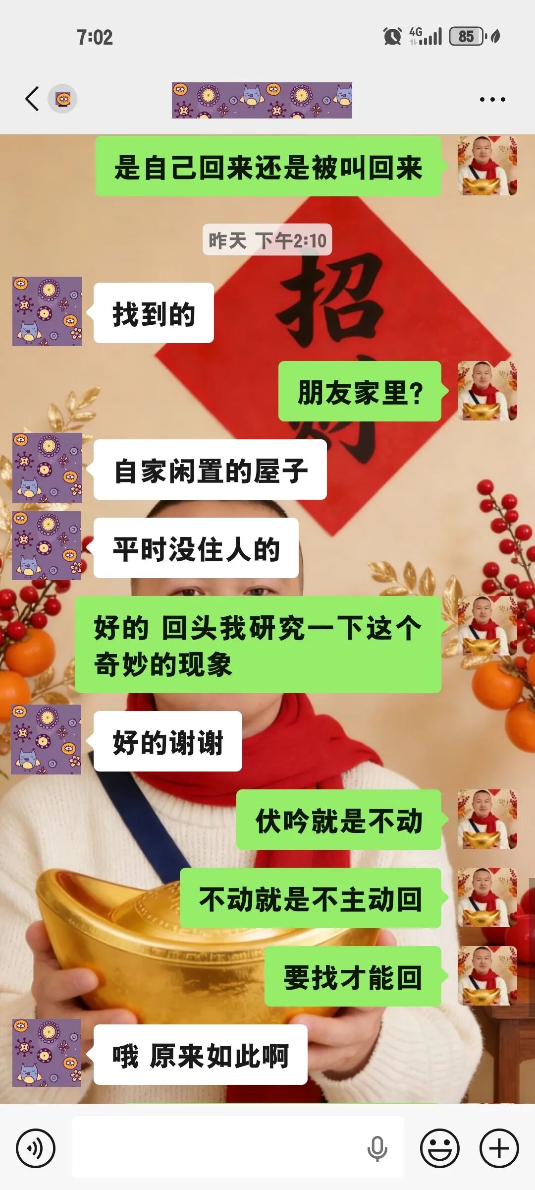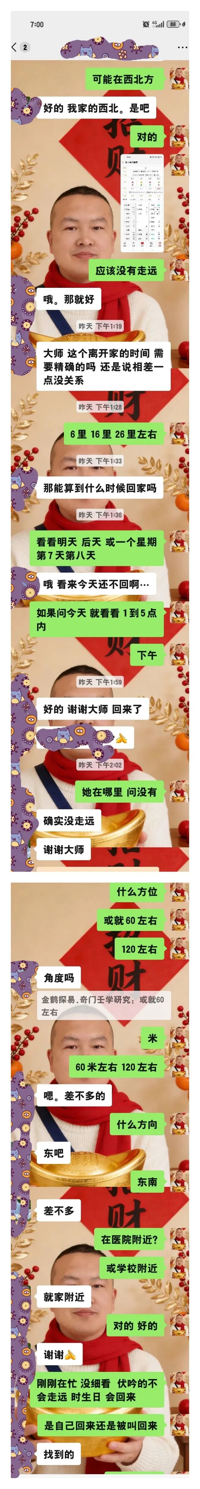 为何断没走多远?因为八门九星三奇六仪皆伏吟,伏吟为不动就是走不远。为何断在西北方位?找人通常来说以杜门为躲藏地,然而巽宫虽然临杜门但空亡,空亡主取对宫,时干辛及母亲年命壬暗干都落对宫乾宫又上乘值符,故断在西北方去找,但实际反馈母亲在家的东方偏东南找到的,实际上杜门与六合都是行人的方位,这个没有断验。为何断后天大后天或一个星期的第七第八天回来?因为问卦时间为3月3日为丙子日,随后到4日5日(即转到艮宫的丑寅日)冲动坤宫的马星为应期,以及第七天第八天(即转到坤宫的未日申日)临马星日为应期。由于当时在忙就大致这样简短看了一下,卦主又问今天回来不了吗?我说今天就看下午1到5点(即未申时)实际刚问完卦十分钟不到在下午1点过点就反馈回来了。为何断60米120米?乾六宫为六数,取60,伏吟双数取120米。