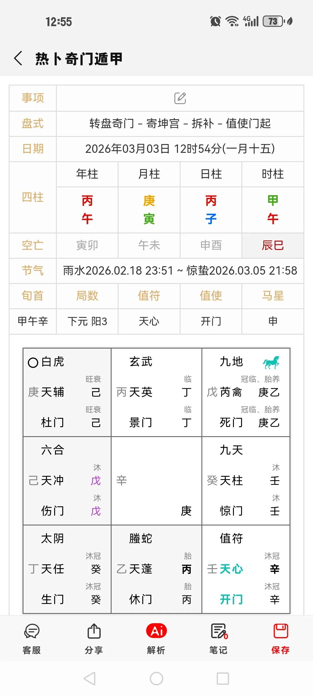 日干为丙火落于坎宫丙加丙为悖格主悖逆之事,丙火又为太岁可看做母亲,逢此格主与家人不合,丙火本身又是脾气大,又逢胎地主躲藏起来了,逢天蓬星主黑夜主失去这里也主母亲离家出走躲起来玩消失,上乘腾蛇主母亲情绪不稳心里纠结,腾蛇又主多变化主变动,临休门说明事情消停了但是人不知道跑哪了,腾蛇就是跑了,这里腾蛇也主虚诈之神让家人担忧。