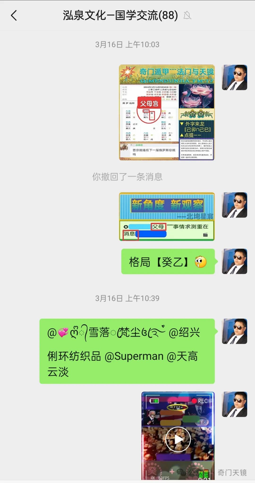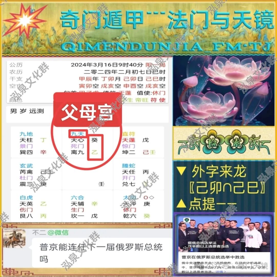 💫前不久 关于俄罗斯🇷🇺现总统普京在即将开始的总统大选中 能不能成功连任的问题 易友们在奇门实战群展开了讨论 有易友提出问题并起局 有易友对此展开讨论 作为奇门遁甲_天镜学术系统 对此卦做了一次公允、客观的奇门信息数据提取 让数据说话的方式 渐渐纠正了预测者在主观观察上的纰漏、弥补了在提取卦局数据时的盲区、并剔除了在信息表达上的个人立场•倾向的有失公允 ;接下来 我们就群实战的聊天记录来回顾这个卦 在从问题的提起 到数据信息的给予 是哪种视听体验🤘🏻