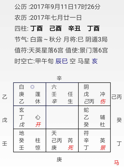 他首先面测事业,那么值符就是个领导或老板了,他实际是个小领导,做药材生意的,气质很好。但是他的宫位景门门迫。景门为风景,对男人来说为前程,门迫,事业前程不顺。再加上辛,丁,就是事业前程出现差错。
